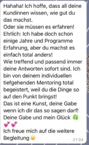 Wie treffend und passend immer ihre Antworten sofort sind. Ich bin von ihrem individuellen tiefgehenden Mentoring total begeistert, weil sie die Dinge so auf den Punkt bringst!