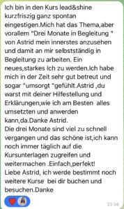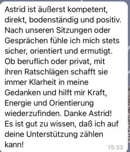 Astrid versteht es, ihren Blick in die Seele mit viel Empathie zu vermitteln, Hoffnungen wieder zu beleben, den Blick auf das Positive zu richten. Selbst die möglichen Hürden lassen einen nicht verzagen und Mut schöpfen. Astrid, ist ein wichtiger Fels in der Brandung. Besonders hervorheben möchte ich ihre persönliche und tägliche Telegrambegleitung. Das kannte ich so nicht, ist einzigartig und besonders hilfreich, wenn man so wie ich, mitten in Gefühlen steckenbleibt. Merci.